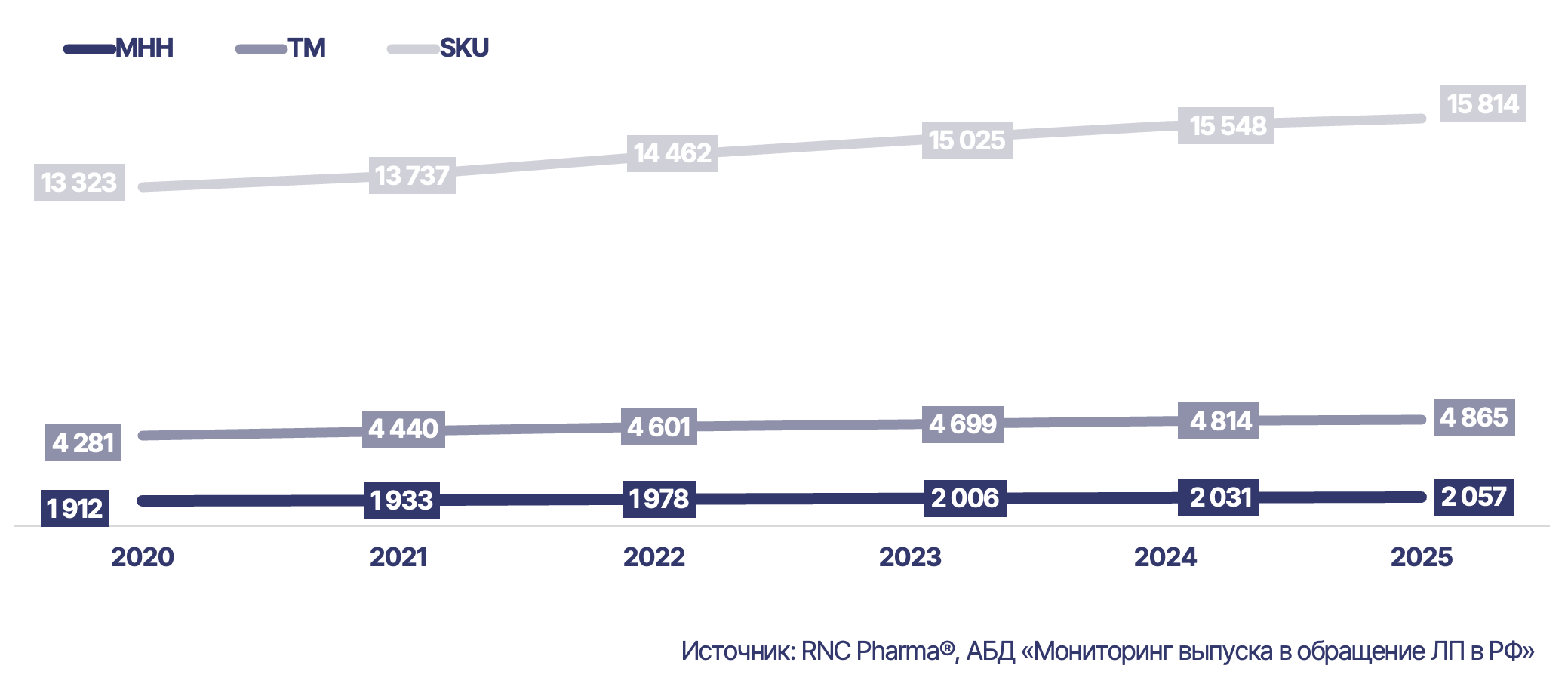 Согласно базе данных «Мониторинг выпуска в свободное обращение ЛП в РФ», рынок перешел от фазы активного заполнения полок к качественной ротации. Если в 2024 году ассортимент прирос на 523 наименования, то в 2025 году — всего на 266 позиций (+51 новый бренд). Общее число SKU достигло 15,8 тыс.