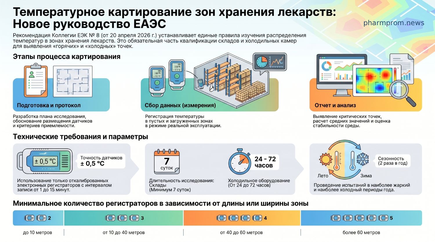 Для фиксации данных должны использоваться электронные логгеры с абсолютной погрешностью не более ± 0,5 °C. Приборы в обязательном порядке должны быть поверены или откалиброваны. Руководство устанавливает риск-ориентированную сетку размещения регистраторов:
