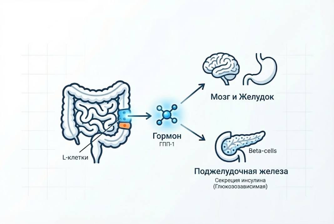 ГПП-1 (GLP-1) (Глюкагоноподобный пептид-1) — это пептидный гормон из семейства инкретинов, вырабатываемый энтероэндокринными L-клетками дистального отдела тонкого кишечника в ответ на прием пищи. Он играет ключевую роль в регуляции гомеостаза глюкозы и контроле аппетита.