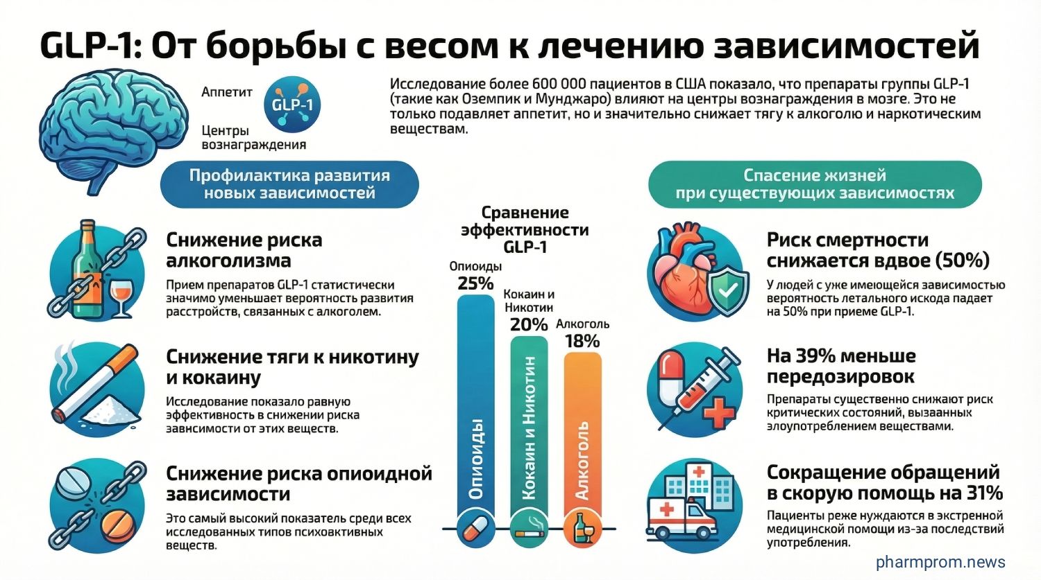 Новое исследование, опубликованное в The Guardian, демонстрирует, что популярные GLP-1 препараты, используемые для лечения диабета и снижения веса (такие как семаглутид и тирзепатид), способны значительно снижать риск развития зависимостей и смертности от передозировок.