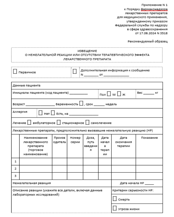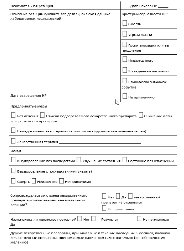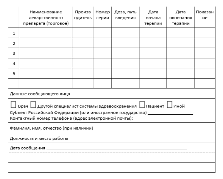 Если характер сведений не соответствует содержанию бланка, допускается представление сведений в произвольной форме. При самостоятельном заполнении отчёта о нежелательном явлении (НЯ) или нежелательной реакции (НР), а также рекламации по качеству необходимо зафиксировать следующее: данные о пациенте, сведения о репортёре, описание события, информация о продукте, время ее получения.