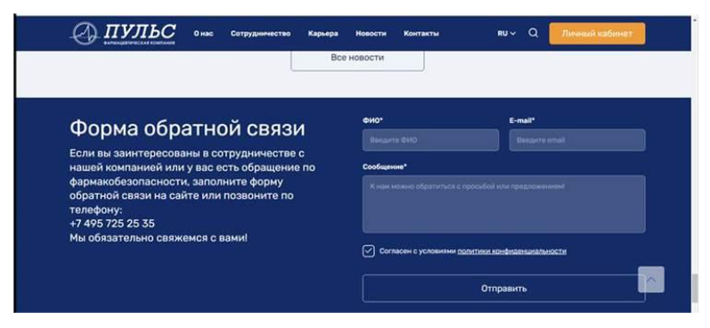 Нами был создан САРА-план, мы обновили версию нашей СОП по фармаконадзору, значительно ее дополнив, создали дополнительный электронный адрес и форму обращения пользователя по вопросам фармакобезопасности на сайте компании (рисунок 2), провели обучение всех сотрудников, которым может поступать информация о нежелательных реакциях на применение препаратов, не пропустили тестовое письмо и тестовый телефонный звонок, правильно обработали полученную информацию, передали ее производителю.