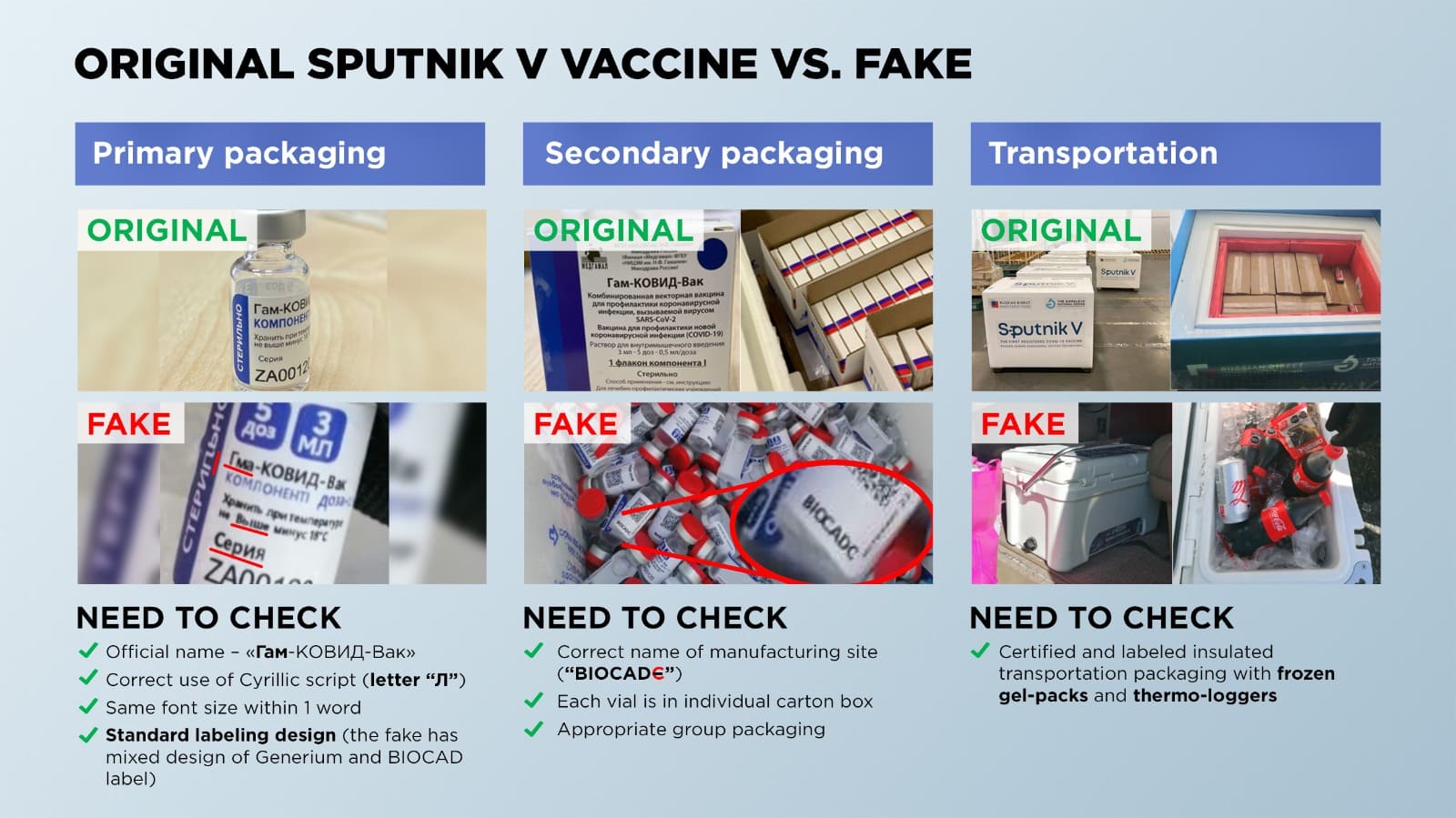РФПИ заявляет, что каждая произведенная партия вакцины «Спутник V» проходит самый строгий контроль. Каждая ампула вакцины имеет уникальный QR-код, позволяющий РФПИ и партнерам отследить ее происхождение. Транспортировку вакцины «Спутник V» осуществляют только авторизованные перевозчики, которые соблюдают самые высокие стандарты безопасности, включая дистанционный контроль температуры.