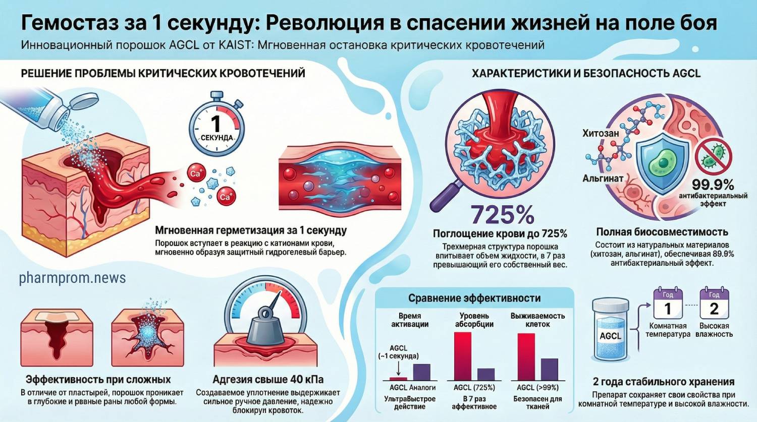 Группа ученых из Корейского института передовых технологий (KAIST) представила прорывную разработку в области военно-полевой медицины. Исследователи создали порошкообразное средство, способное остановить сильное кровотечение всего за одну секунду после нанесения. Технология, разработанная при участии действующего офицера армии, призвана кардинально изменить статистику выживаемости в зонах боевых действий и при катастрофах.